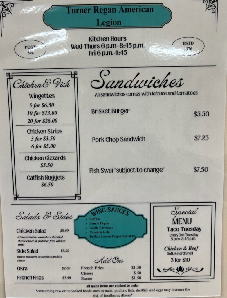 | Legionnaire General Membership meeting, 1st Wednesday of the month , 6pm Ladies Auxiliary General Membership meeting, 1st Monday of the month, 7pm Sons of the American Legion Membership meeting, 1st Tuesday of the month, 6pm Legion Riders General Membership, 4th Tuesday of the month, 6pm |